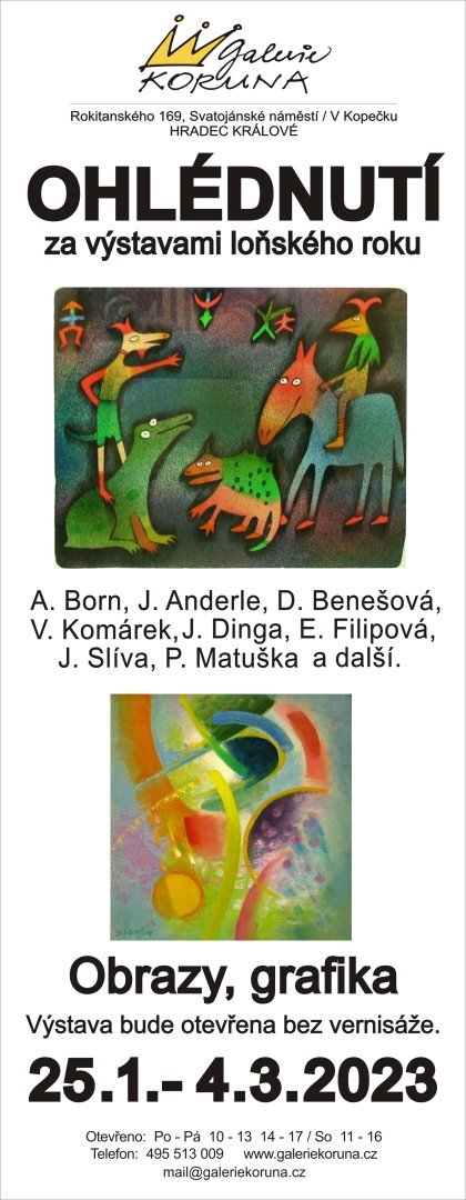 Vážení přátelé výtvarného umění, zveme na první výstavu letošního roku s názvem OHLÉDNUTÍ. Vystavena budou díla Jiřího Anderleho, Daniely Benešové, Adolfa Borna, Jiřího Slívy, Evy Filipové, Pavla Matušky a dalších autorů.
