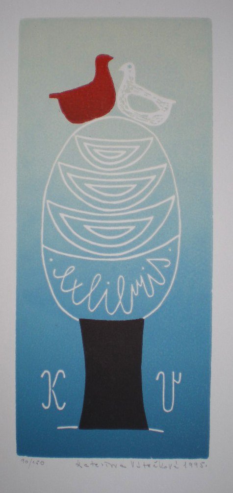 PRODÁNO, barevný dřevořez s dřevorytem, 1994, číslováno 90/150, rozměr 17 x 7,5 cm (33 x 21 cm s rámem), sign., rám.